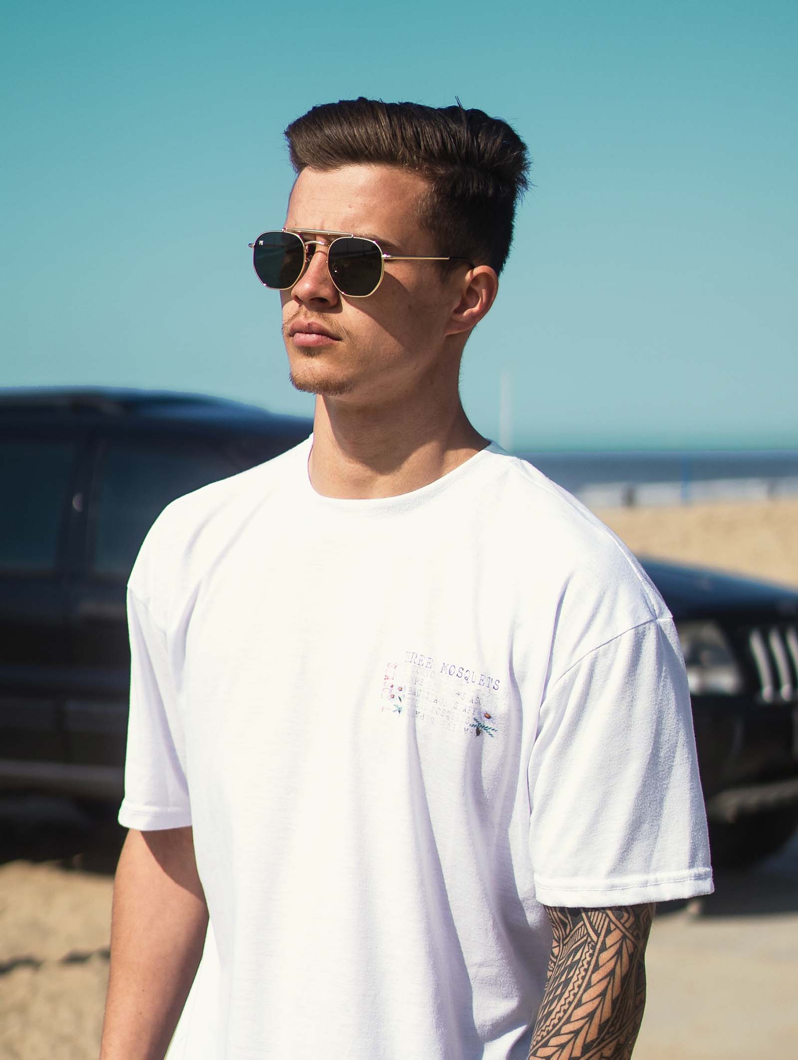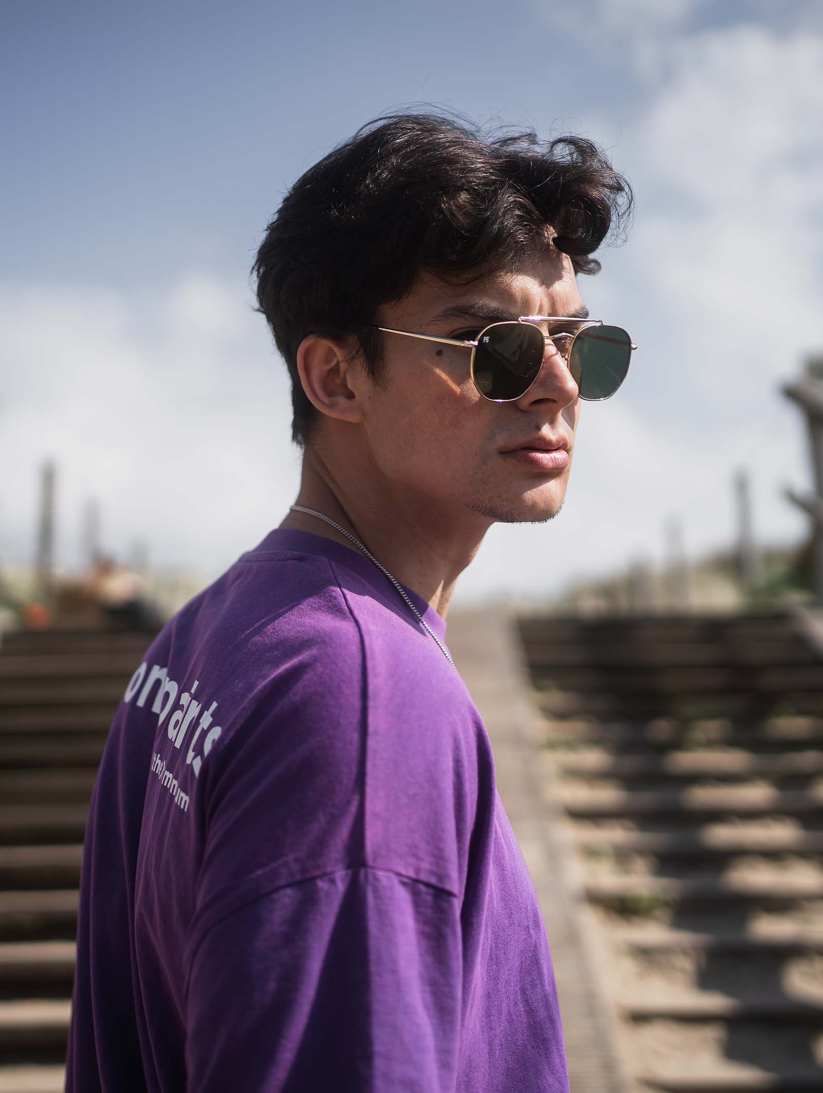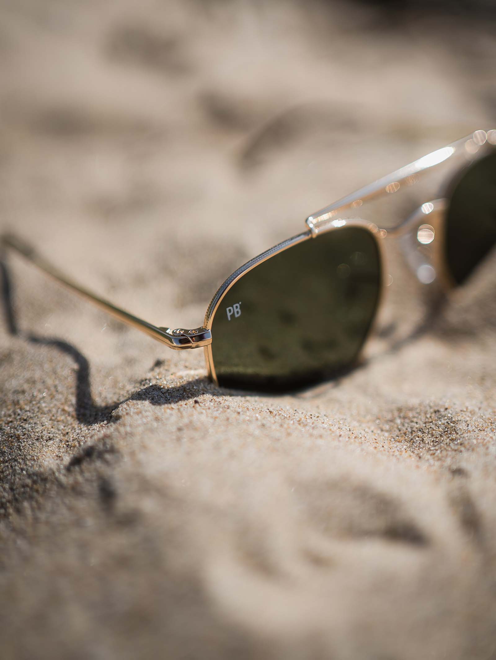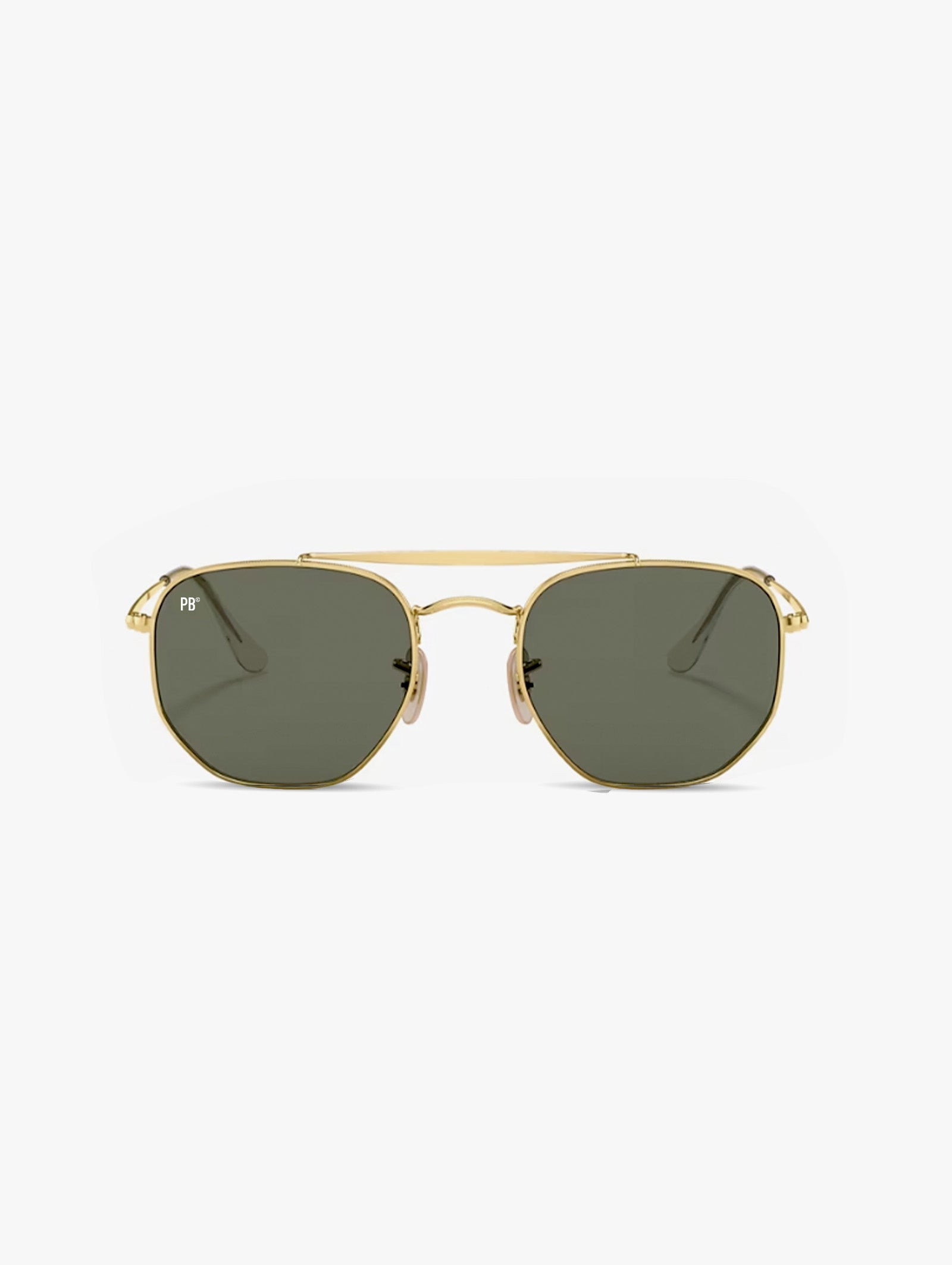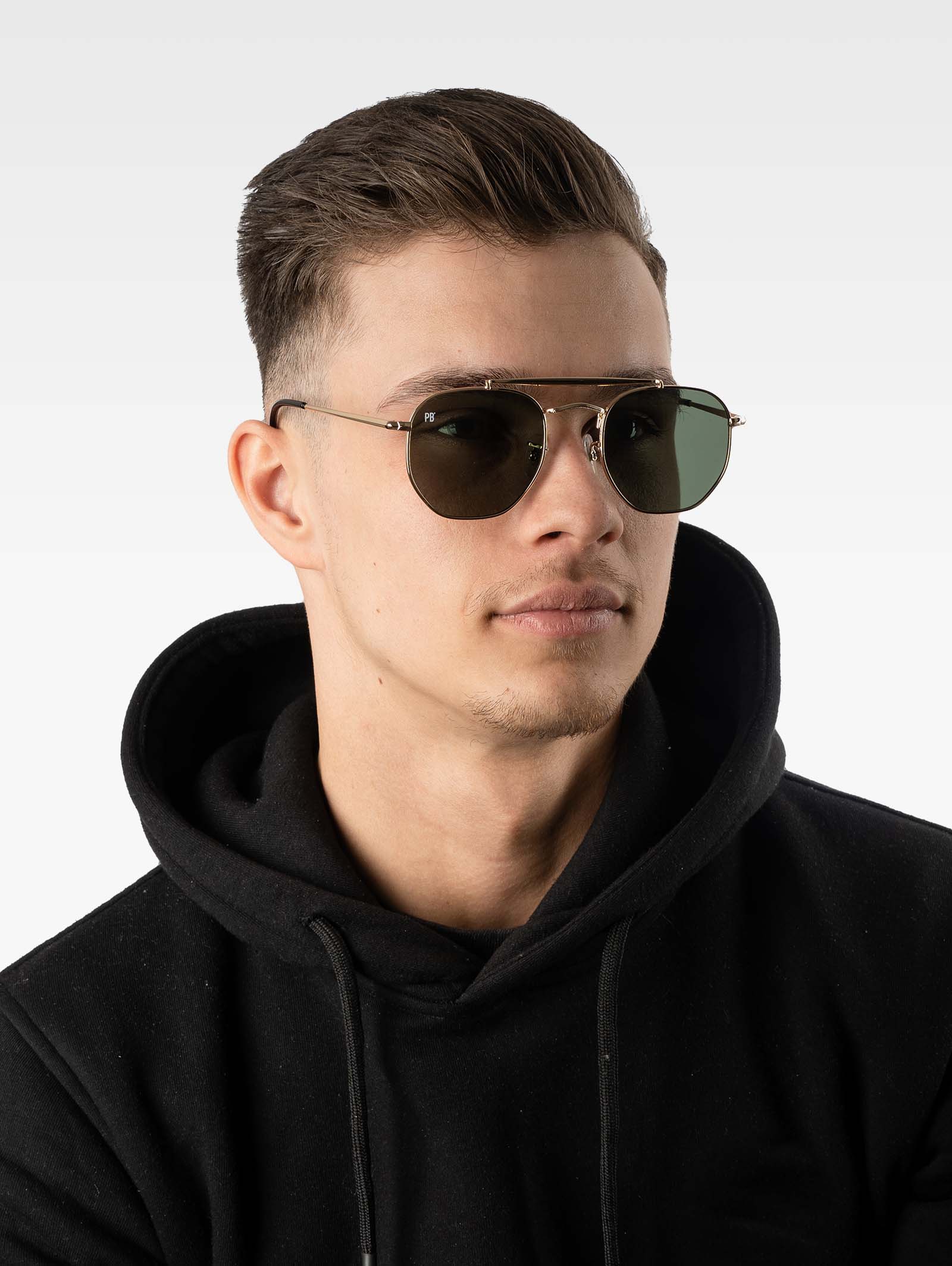 Die Bridge Sonnenbrille von PB Sonnenbrille ist eine elegante Interpretation der klassischen Pilotenbrille. Der goldene Rahmen mit doppeltem Nasensteg und dunkelgrünen Gläsern verleihen dieser Sonnenbrille einen raffinierten Look, perfekt für Männer und Frauen.